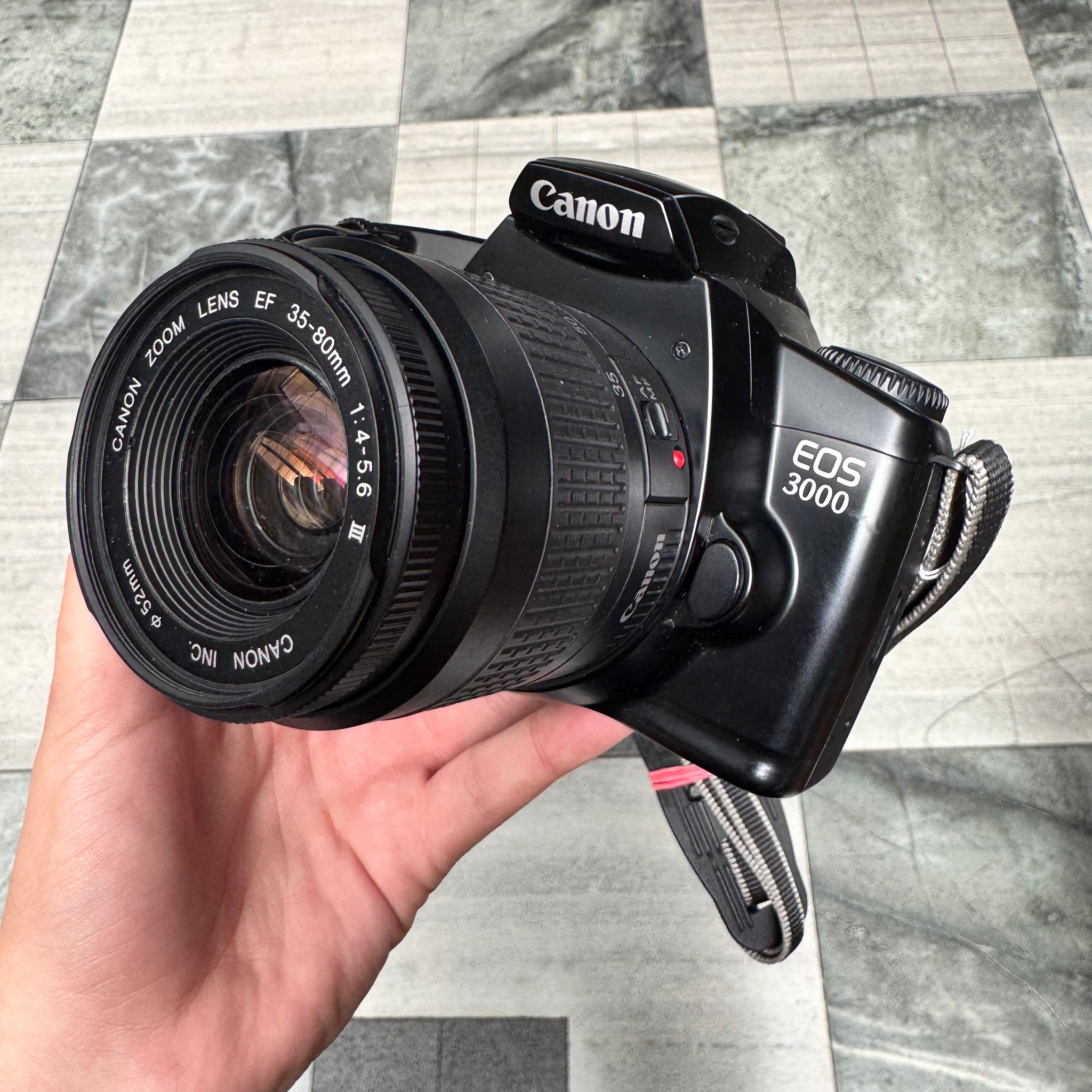 Canon EOS 3000 with Canon Zoom EF 35-80mm f/4-5.6 III lens. The camera also comes with a camera strap!