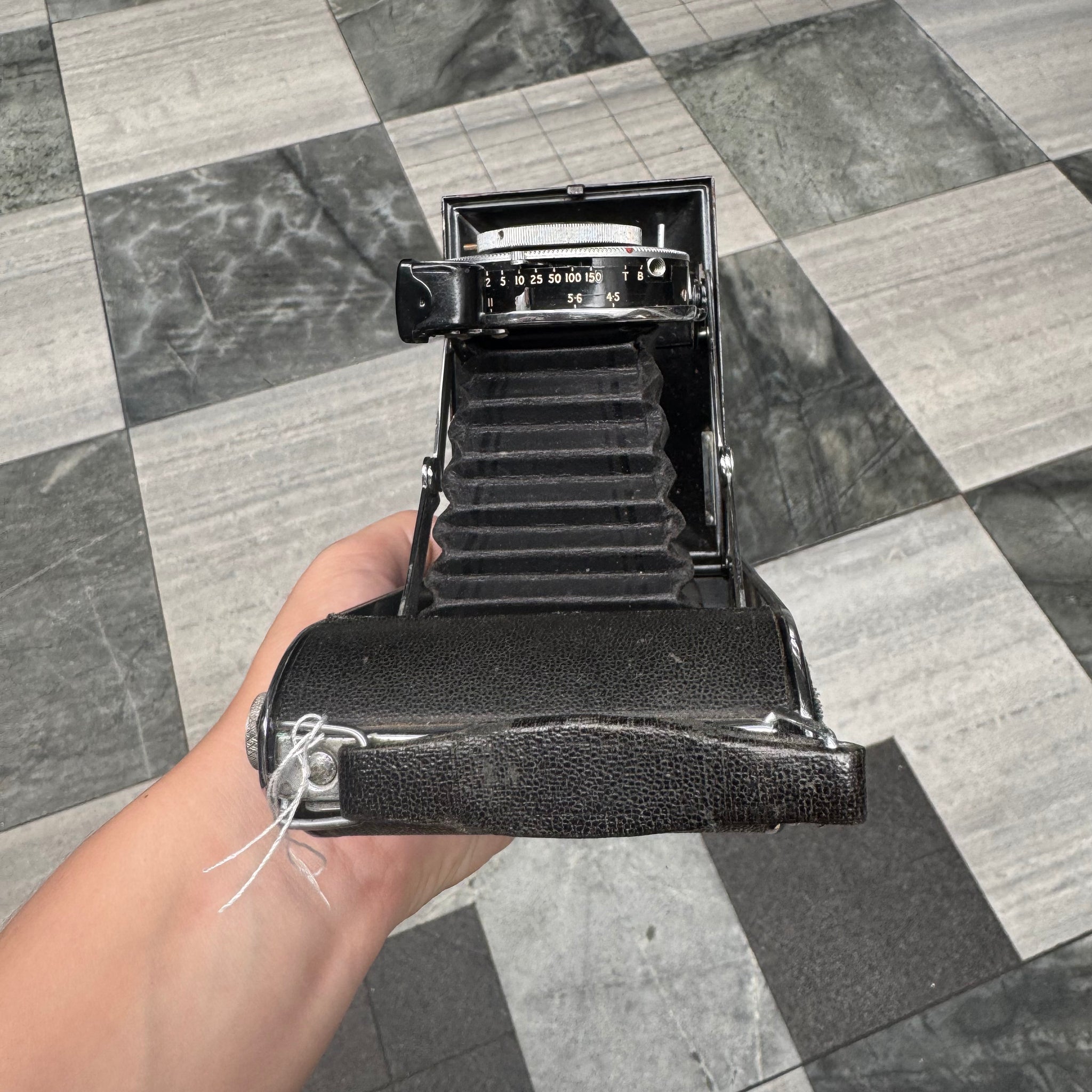 - Viewfinder: lens-mounted brilliant finder and folding glassless eye finder upon top-plate