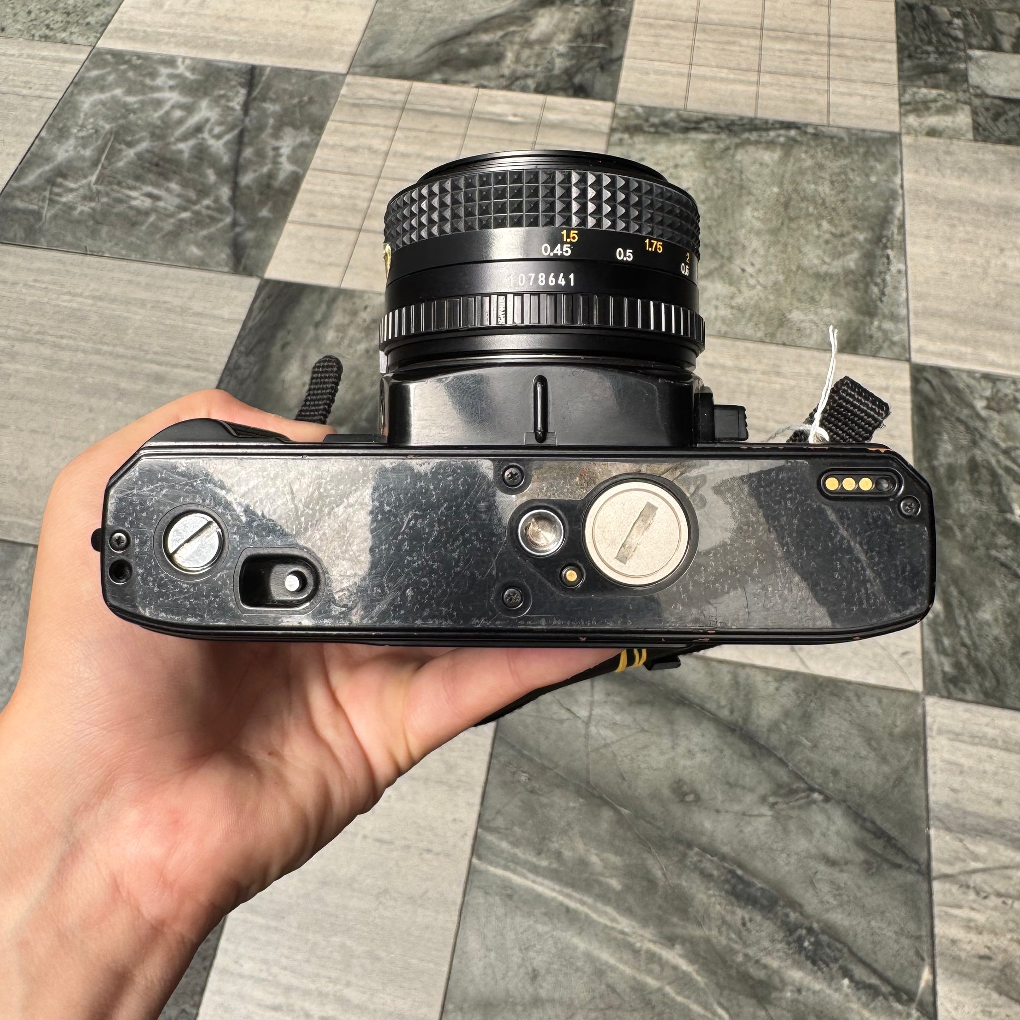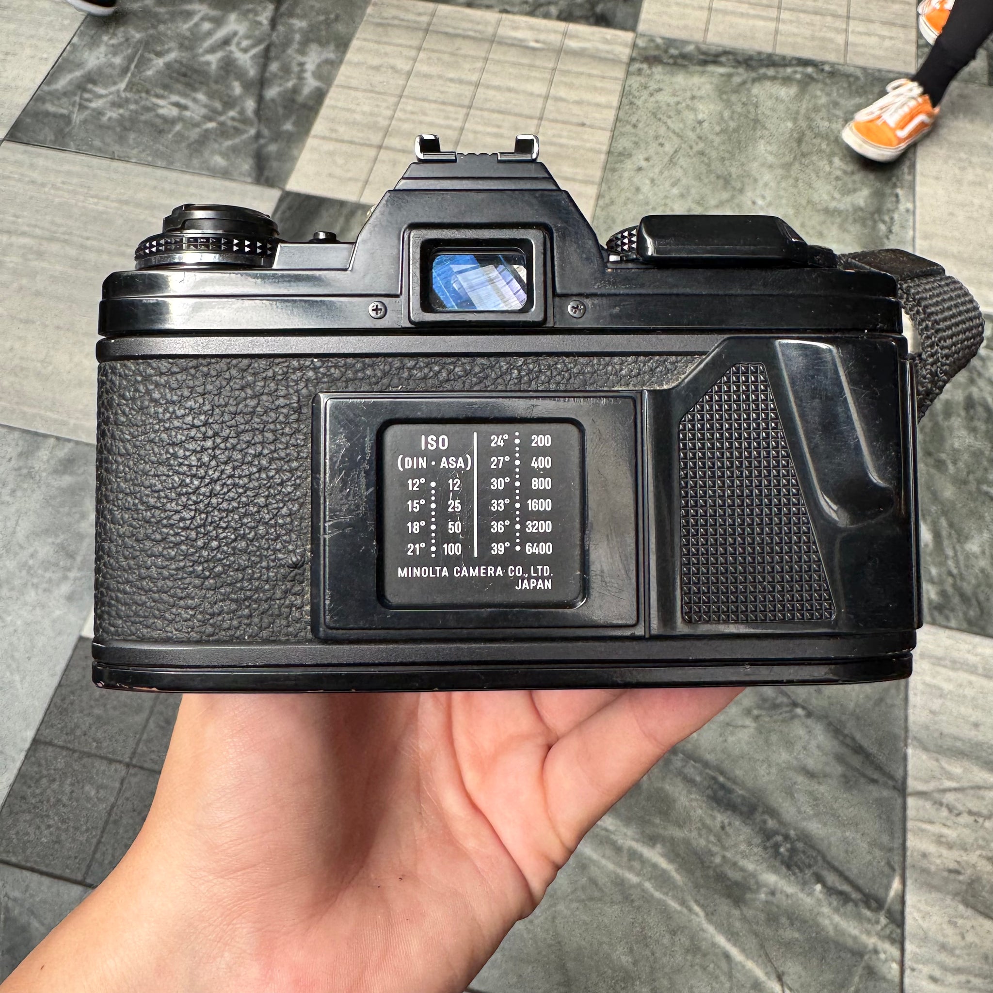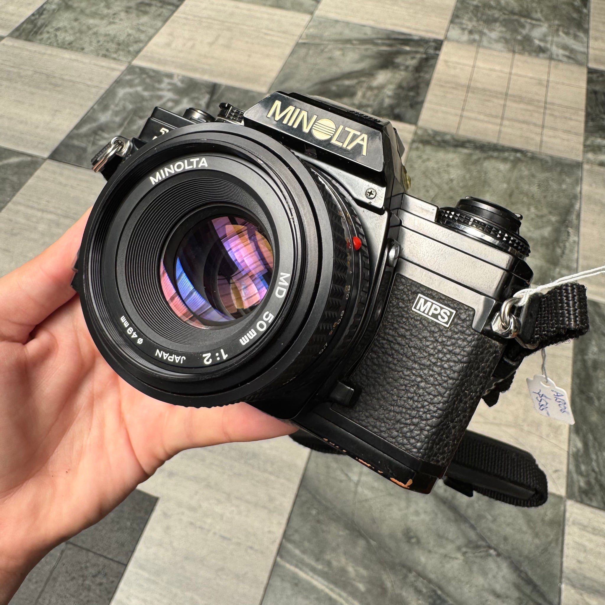 Minolta X-700 with Minolta MD 50mm f/2 lens. This camera also comes with a strap!