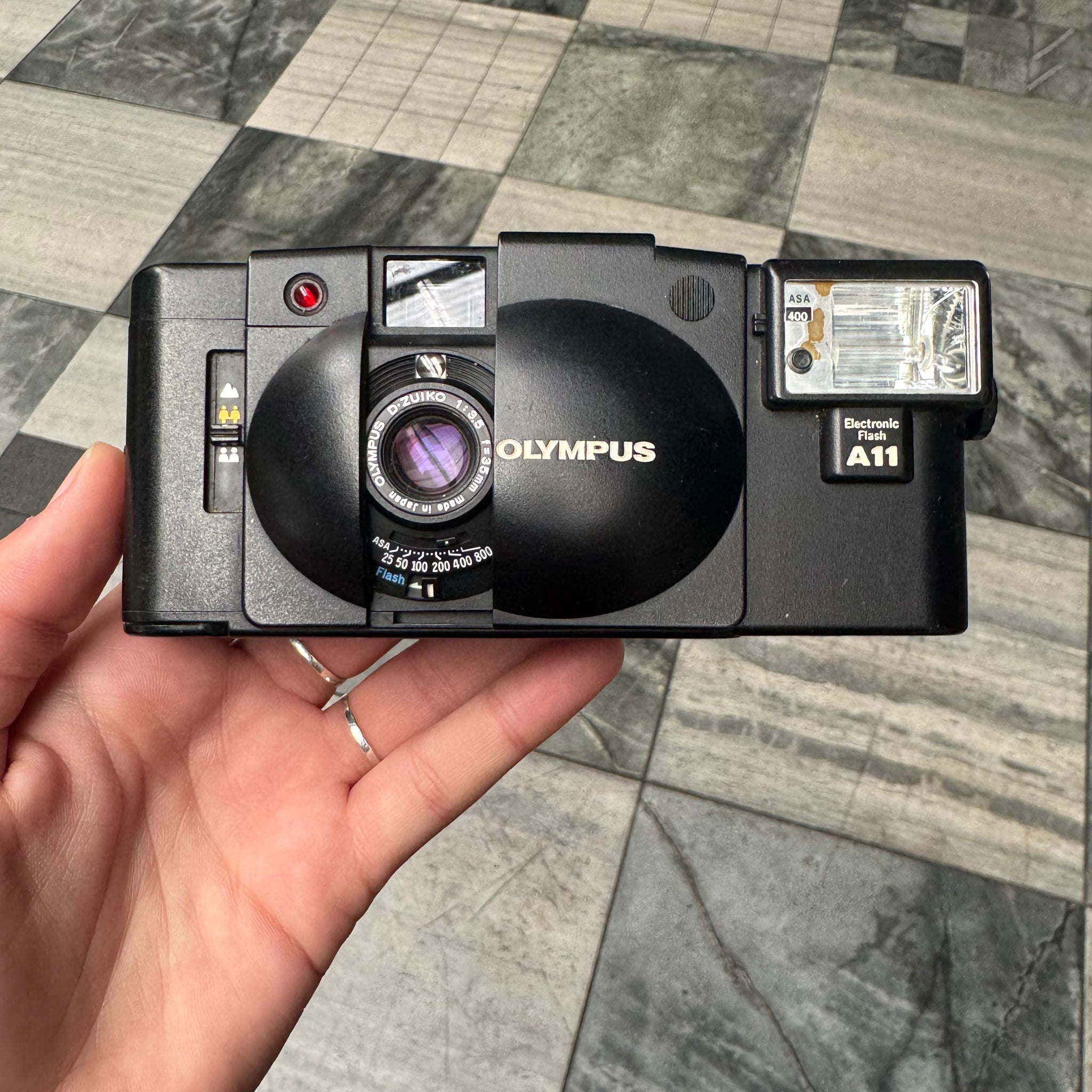 Olympus XA2 with Olympus A11 flash (screwed into the side)!