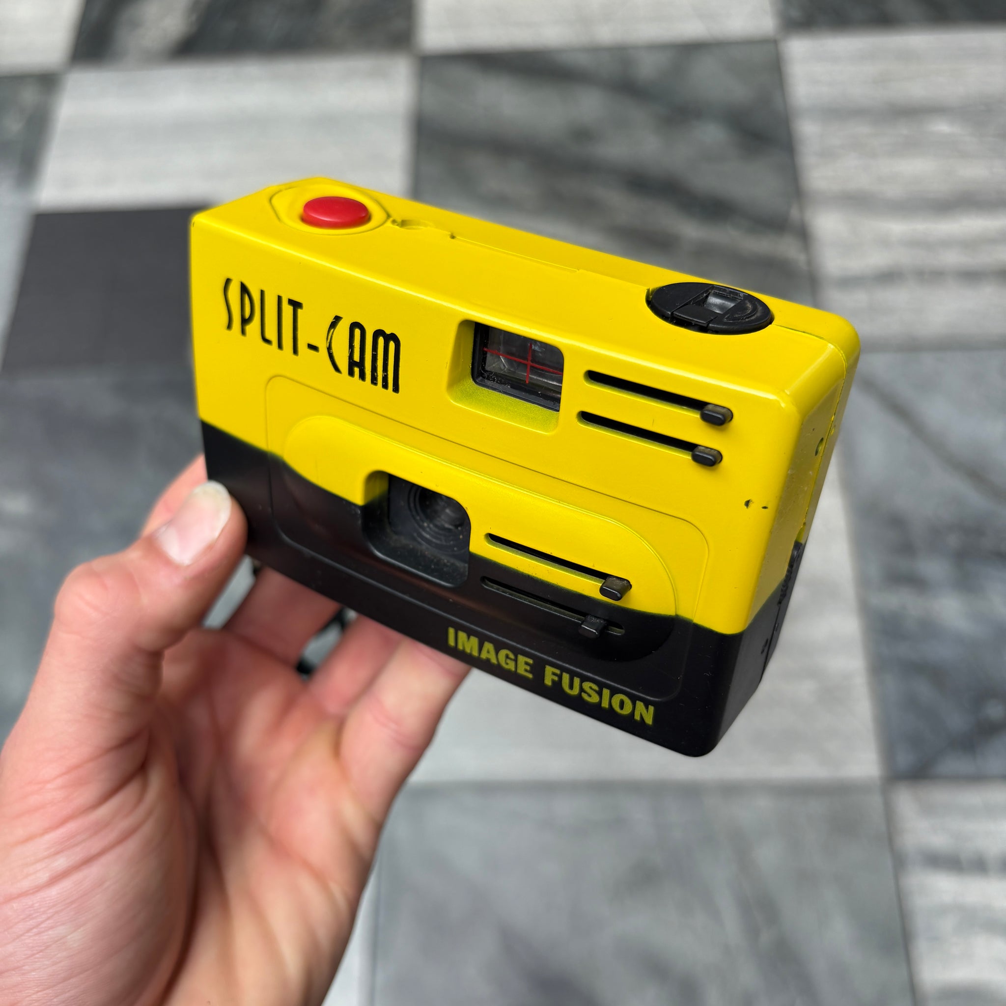 Image Fusion Split Cam is a novelty 35mm film camera that uses a manual multiple-exposure mechanism and sliding lens covers to combine two different images onto a single film frame. This allows for creative effects like merging the top half of one scene with the bottom half of another, often resulting in humorous or artistic "image fusions".